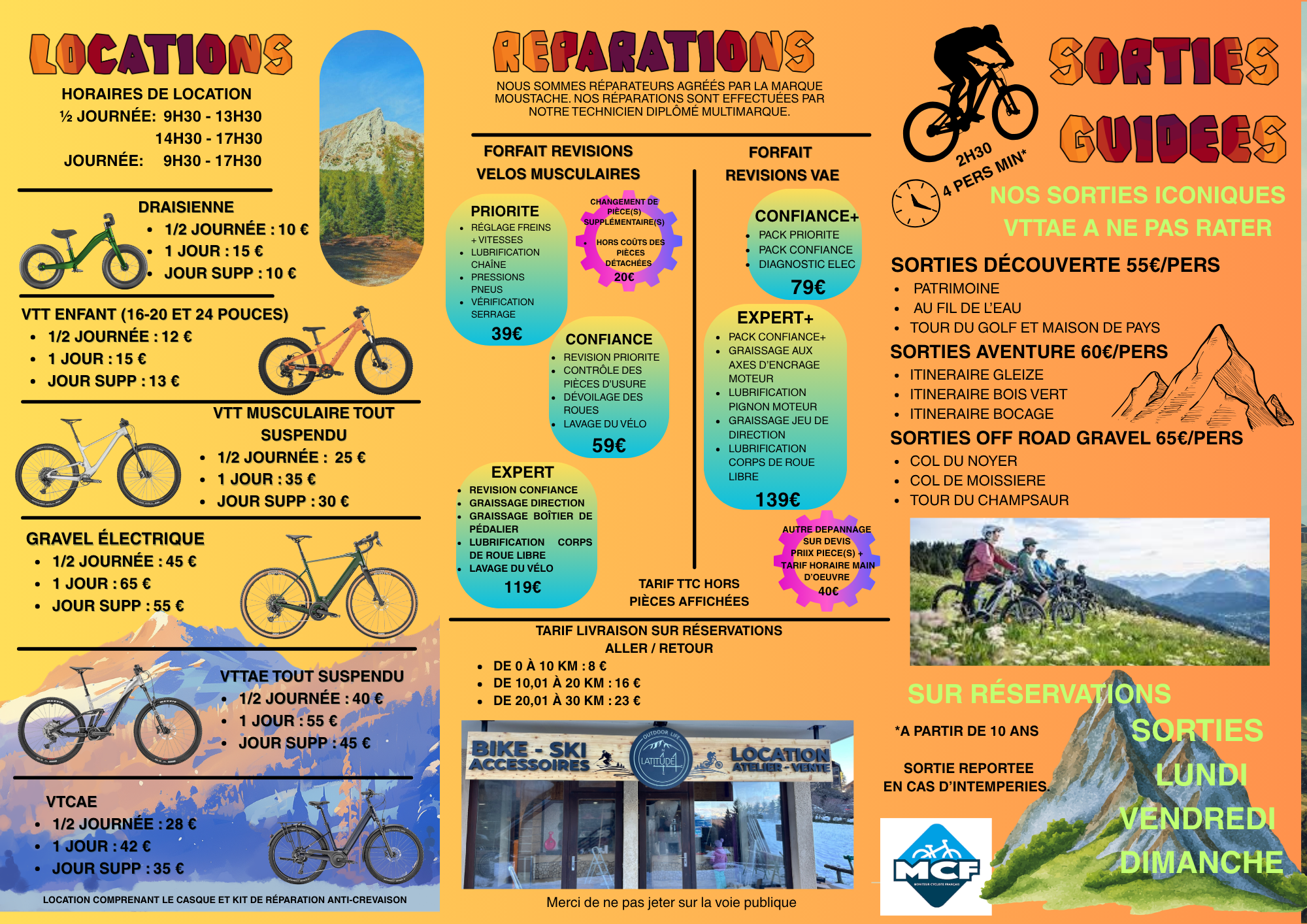 Découvrez un large choix de vélos, VAE et VTC, avec ou sans l’accompagnement d’un moniteur diplômé, pour vos balades, vos randonnées ou pour progresser à votre rythme.