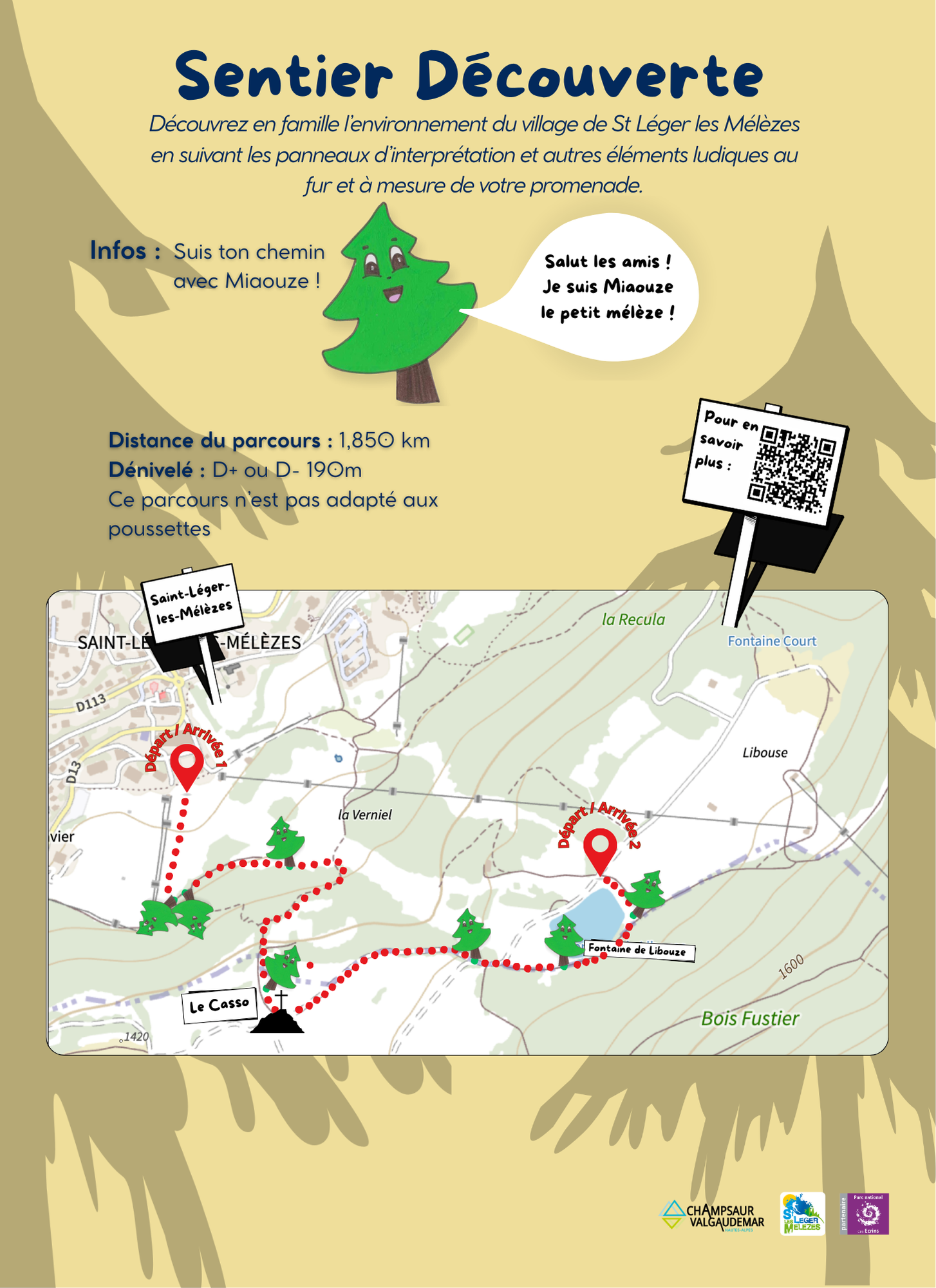 Venez découvrir en famille le village de St Léger-les-Mélèzes grâce aux panneaux d'interprétation et à Miaouze, le petit mélèze du sentier ! Et surtout, ouvrez l’oeil durant votre balade ! Des petits animaux se sont cachés ici et là !
